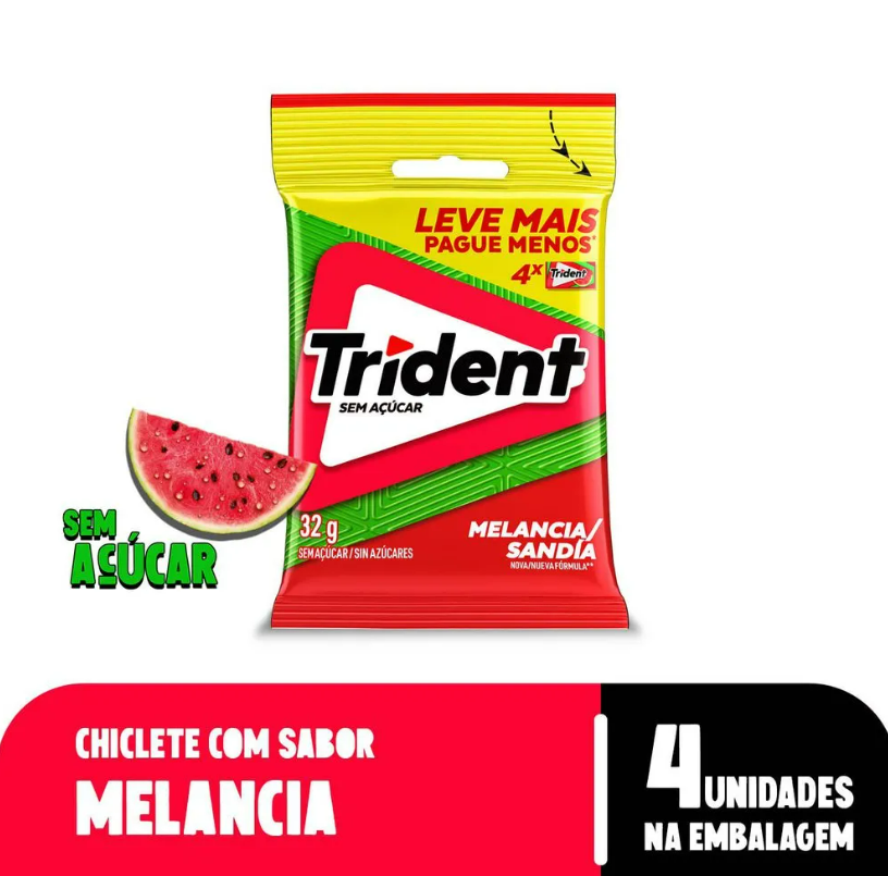 Desfrute do frescor e do sabor suculento do Chiclete Trident Melancia a qualquer momento. Adquira o pacote com 4 unidades e tenha sempre à mão essa refrescância frutada e duradoura!